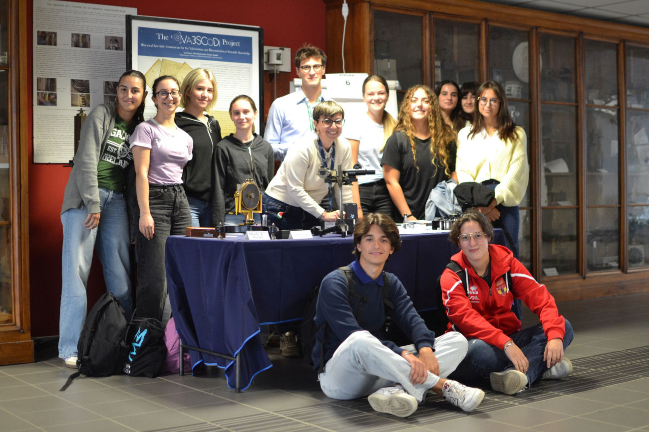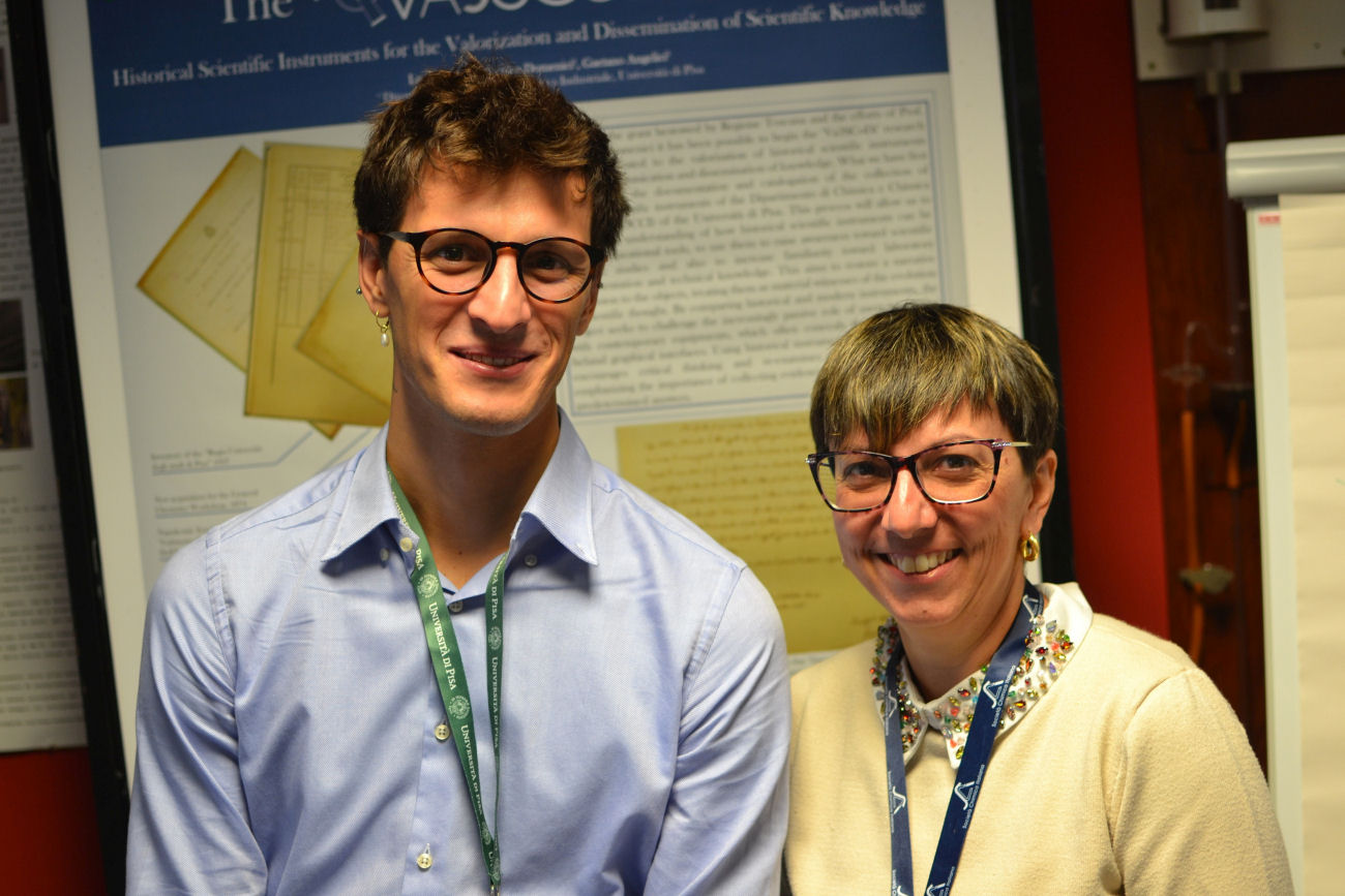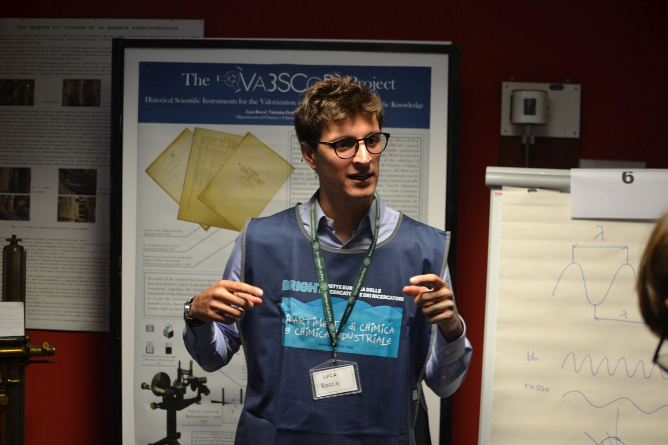 Si è svolto venerdì 26 settembre a Pisa il Bright, la notte europea dei ricercatori e delle ricercatrici. Al Dipartimento di Chimica e Chimica Industriale ci hanno raggiunto centinaia di studenti delle scuole secondarie superiori, e non poteva mancare anche una parte dedicata al nostro progetto di ricerca! Gli studenti hanno potuto osservare ed interagire con due oggetti della collezione di strumenti storici: uno spettrometro di Hilger e un reticolo di Rowland. Prendendo ad esempio questi bellissimi oggetti abbiamo portato i nostri spettatori attraverso le prime scoperte di ottica, partendo dall’esperimento di Newton per la scomposizione della luce bianca per mezzo di un prisma equilatero, e ponendole in relazione con i metodi di indagine della materia propri della chimica. Grazie all’esperienza e alla strumentazione didattica della professoressa Domenici si è potuto sfruttare una sorgente luminosa di luce bianca e numerosi elementi ottici, come ad esempio alcune lenti, specchi, ma anche prismi di diversi angoli e prismi più caratteristici come quello Fresnel. Gli studenti hanno anche potuto condividere dei reticoli didattici in trasmissione e il reticolo di Rowland della collezione. Con questi strumenti sono stati introdotti i concetti fondamentali di Rifrazione, Riflessione, Diffusione, Interferenza e Diffrazione, facendo operare direttamente gli studenti nella manipolazione di prismi e di altri elementi ottici. Con questa nuova comprensione della interazione luce-materia gli studenti hanno potuto apprezzare l’uso di uno spettroscopio portatile e anche dello spettrometro storico di Hilger, facendo passare un fascio di luce bianca e selezionando singolarmente le lunghezze d’onda nel visibile, e osservando quindi i diversi colori attraverso la fenditura.